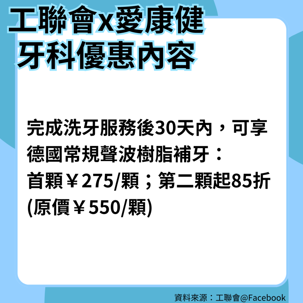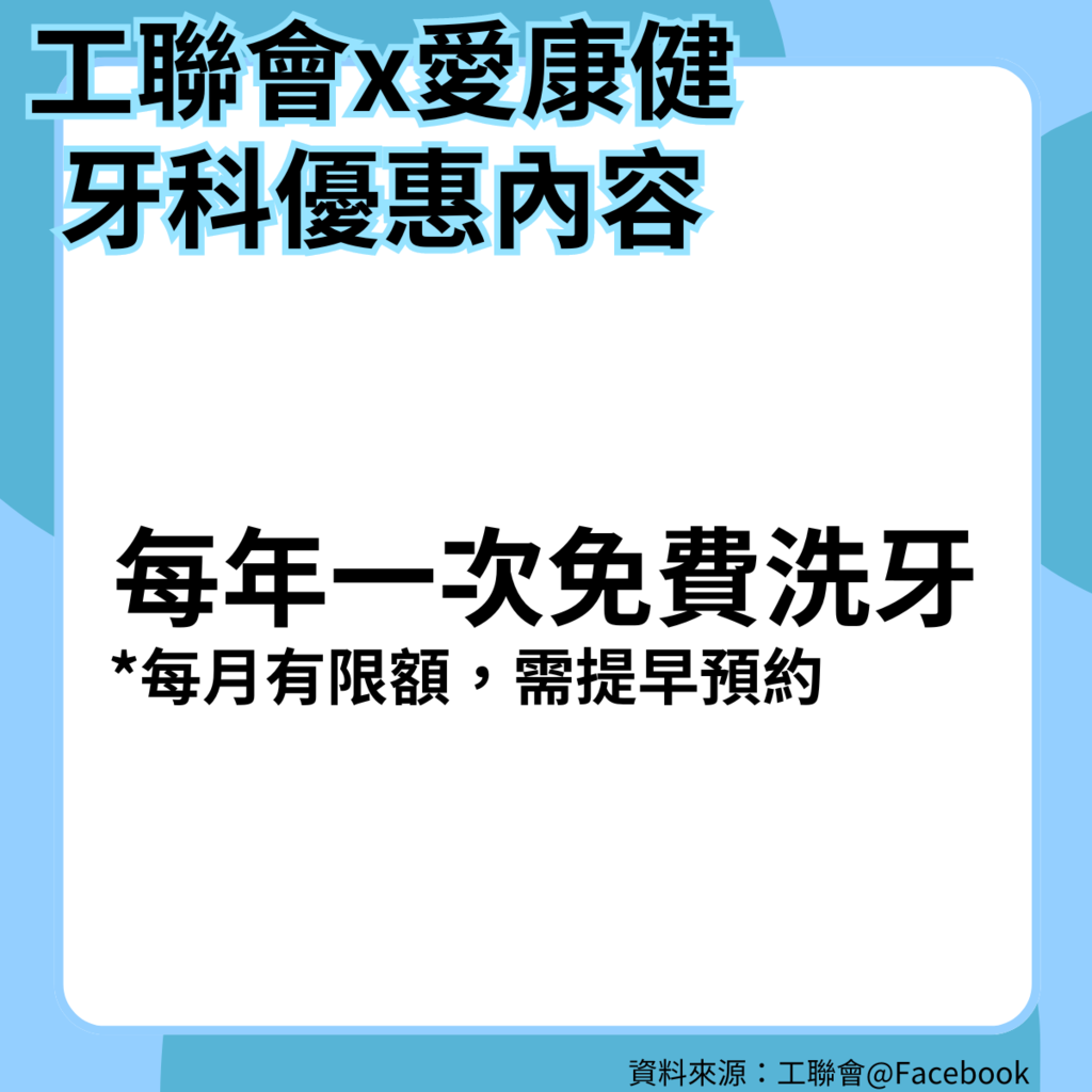 工聯會指,合資格人士(包括工聯會屬會、贊助會會員及工人俱樂部部員)只要致電到「工聯會預約專線」,預約由深圳愛康健口腔醫院提供的牙科服務,包括每年一次免費洗牙、低價補牙服務、以及自動享用愛康健會員價,優惠詳細內容如下: