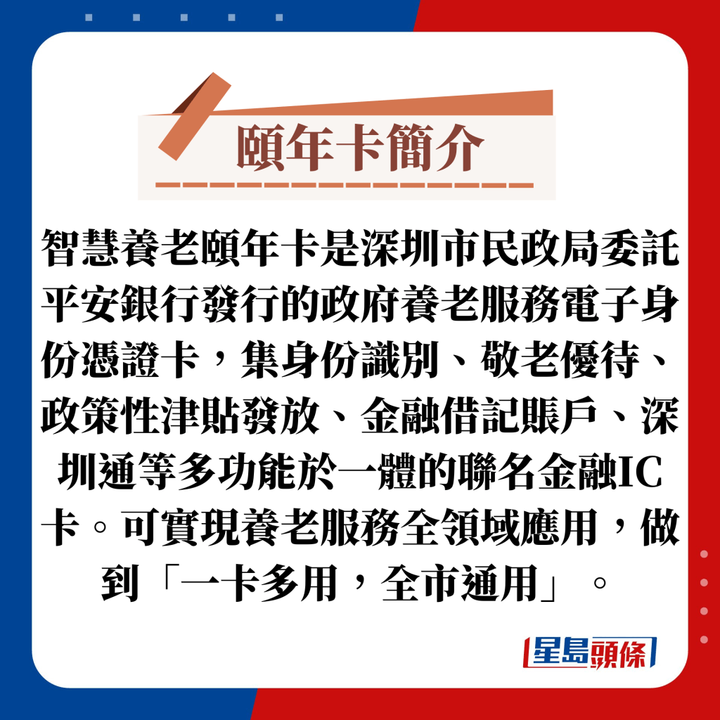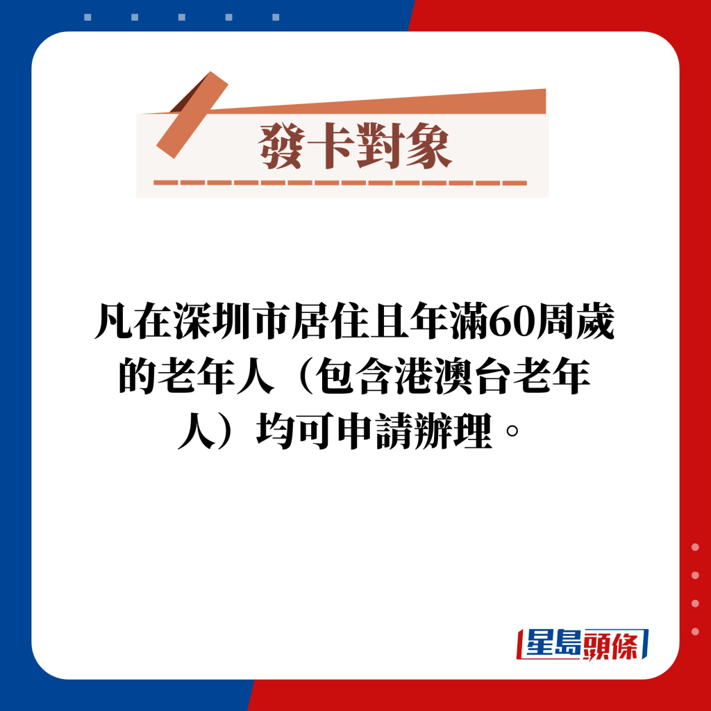 以上14項香港長者可享的深圳優惠及福利中,多項都需要使用「深圳智慧養老頤年卡」(簡稱頤年卡)。申請辦法亦非常簡單,凡在深圳市居住且年滿60周歲的長者(包括港澳台老年人)均可前往指定網點,例如銀行分行辦理相關手續。
